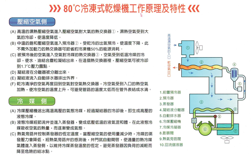 它的工作原理基於冷凝技術,通過將空氣冷卻至低於露點的溫度,使壓縮空氣中的水氣凝結成水珠,再經過排水系統將水分排出。